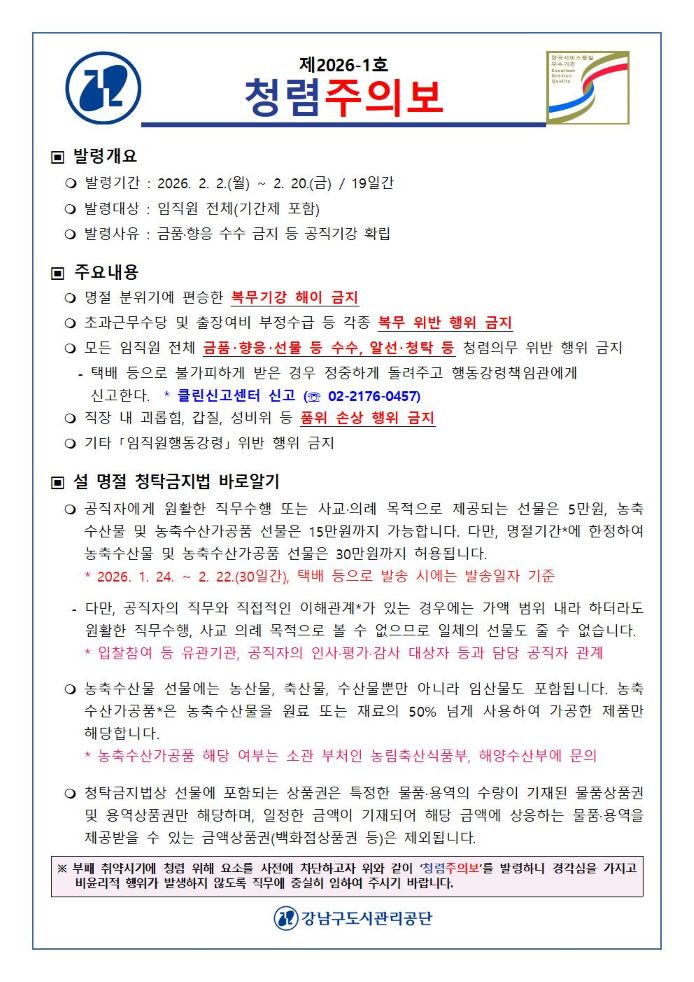 강남구도시관리공단은 2026년 설 명절을 맞아 공직기강 확립과 부패 취약요인 사전 차단을 위해 「청렴주의보(제2026-1호)」를 발령하였습니다.