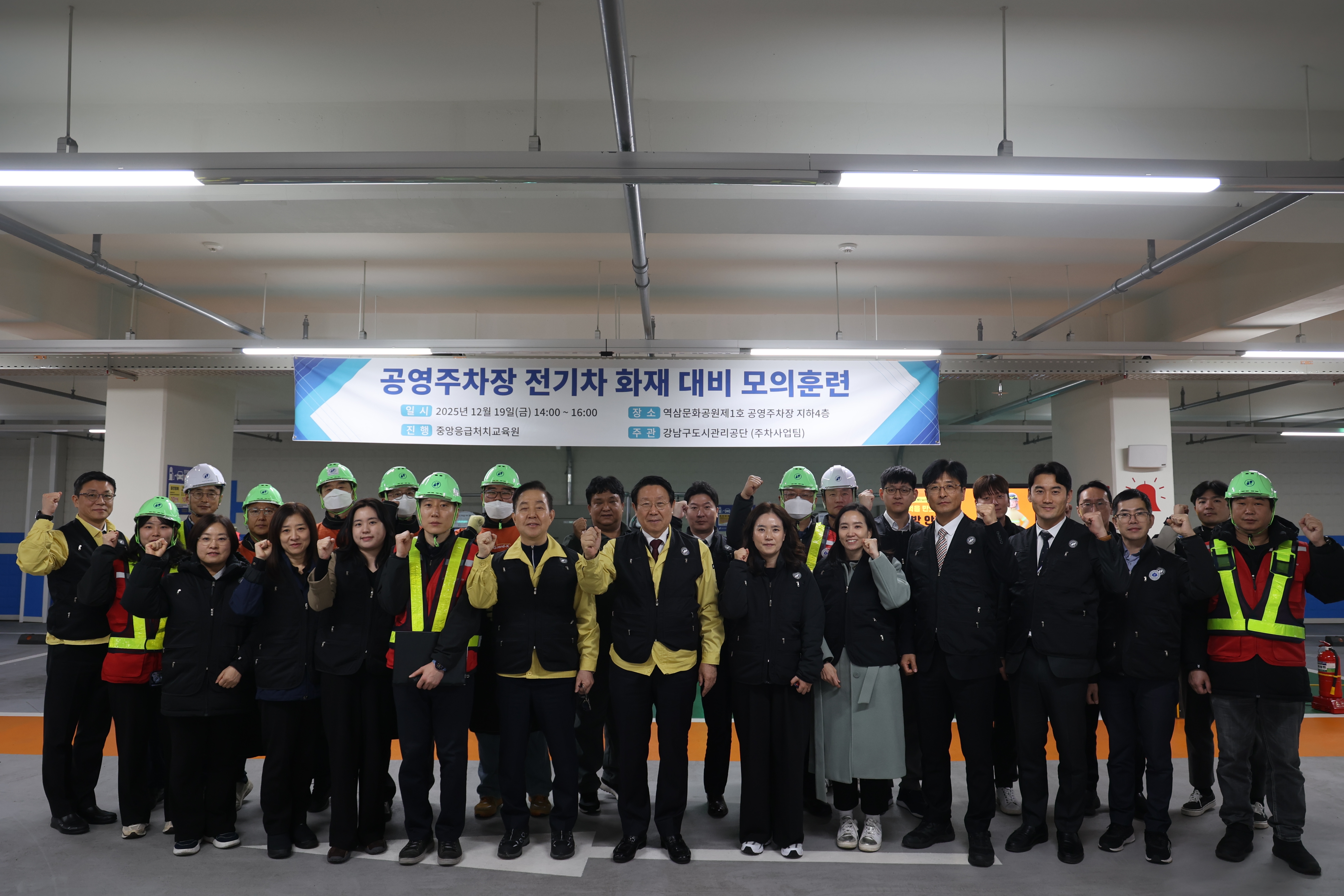 서울시 강남구도시관리공단(이사장 고광윤, 본부장 성호경)은 지난 19일 오후2시 역삼문화공원제1호 공영주차장에서‘중앙응급처치교육원’의 전문강사를 초빙하여 전기차 화재 대비 모의훈련을 실시하였다.