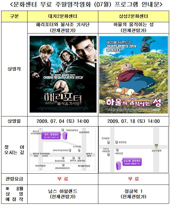 문화센터 무료 주말명작영화 (7월) 프로그램 안내