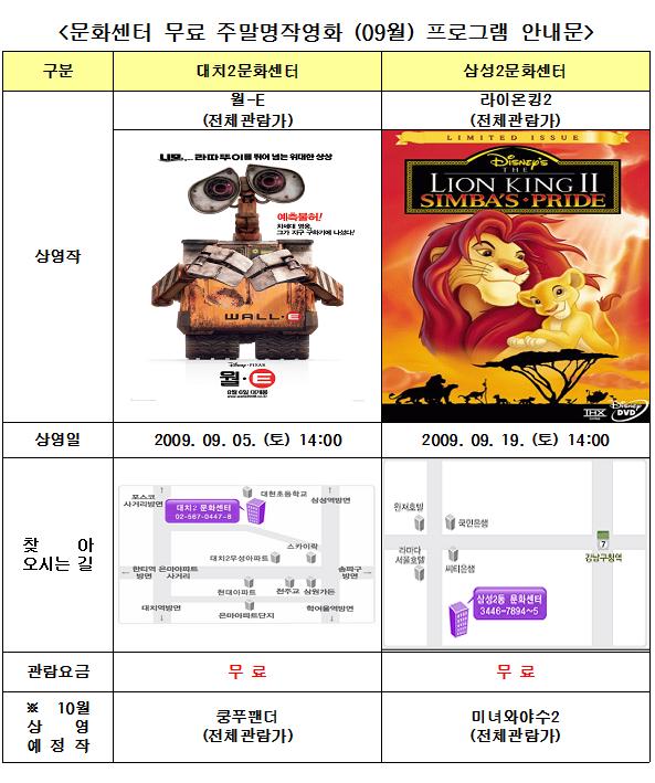 문화센터 무료 주말명작영화 (9월) 프로그램 안내