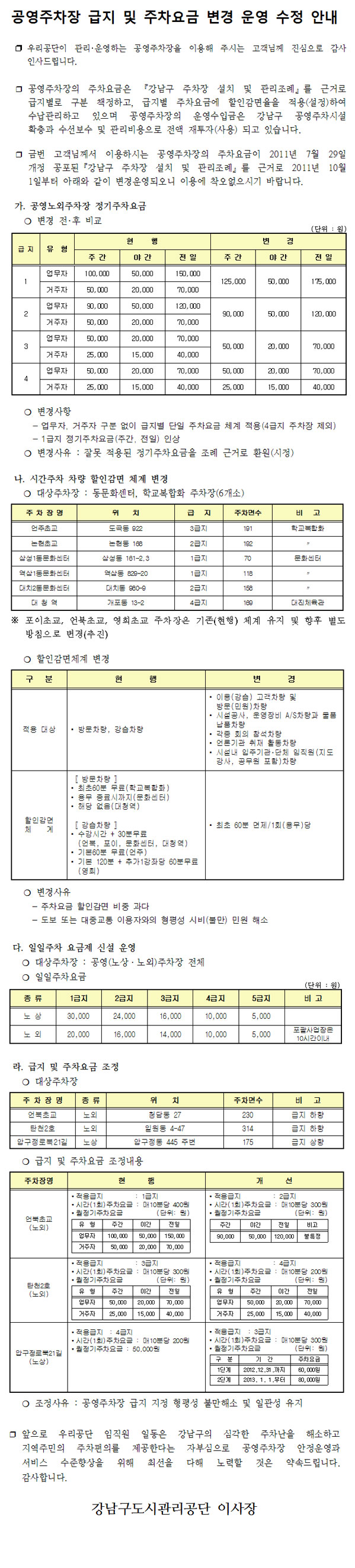 공영주차장 급지 및 주차장요금 변경 운영 안내