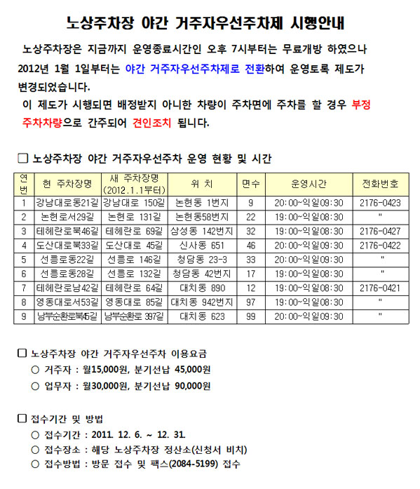 노상주차장 야간 거주자우선주차제 시행안내