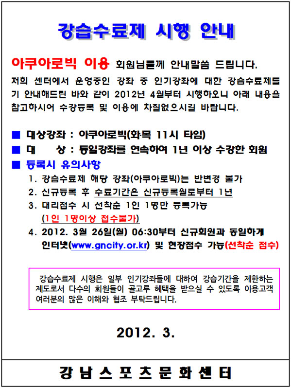 체육, 문화, 취미강좌 종목별 서비스 품질기준 및 이행표준