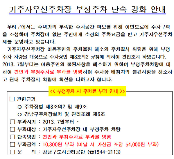 거주자우선주차장 부정주차 단속 강화 안내