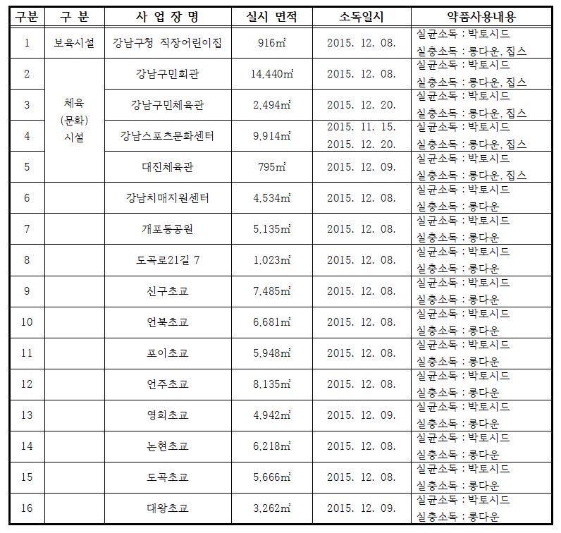 1. 소독대상 : 강남구민회관 등 15개소