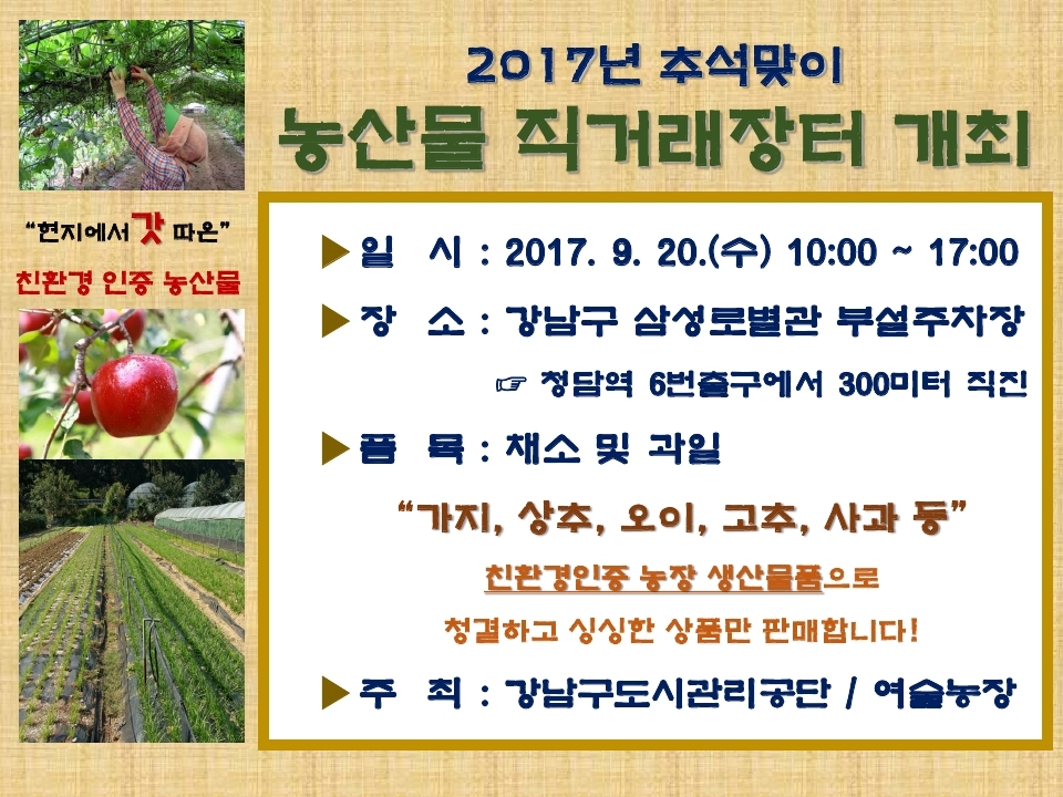 강남구도시관리공단은 추석을 맞이하여 맛좋고 품질 좋은 우리 농산물을 판매하기 위해 오는 9월 20일 강남구청 삼성로별관 부설주차장에서 직거래장터를 개최합니다.