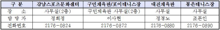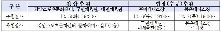 1) 강남스포츠문화센터, 구민체육관, 대진체육관은 전산추첨하므로 추첨일 참여 여부는 당첨 여부와는 관계없음