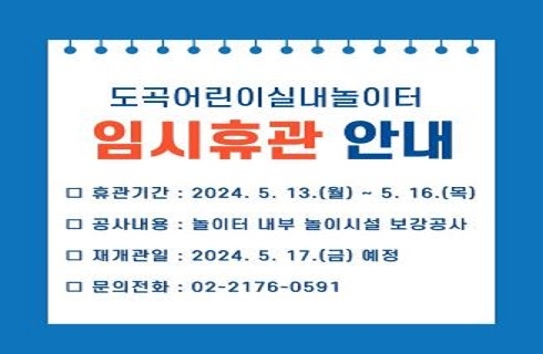 도곡어린이실내놀이터 안전한 놀이시설 정비를 위한 보강공사 진행으로 다음과 같이 임시휴관을 진행하고자 합니다.