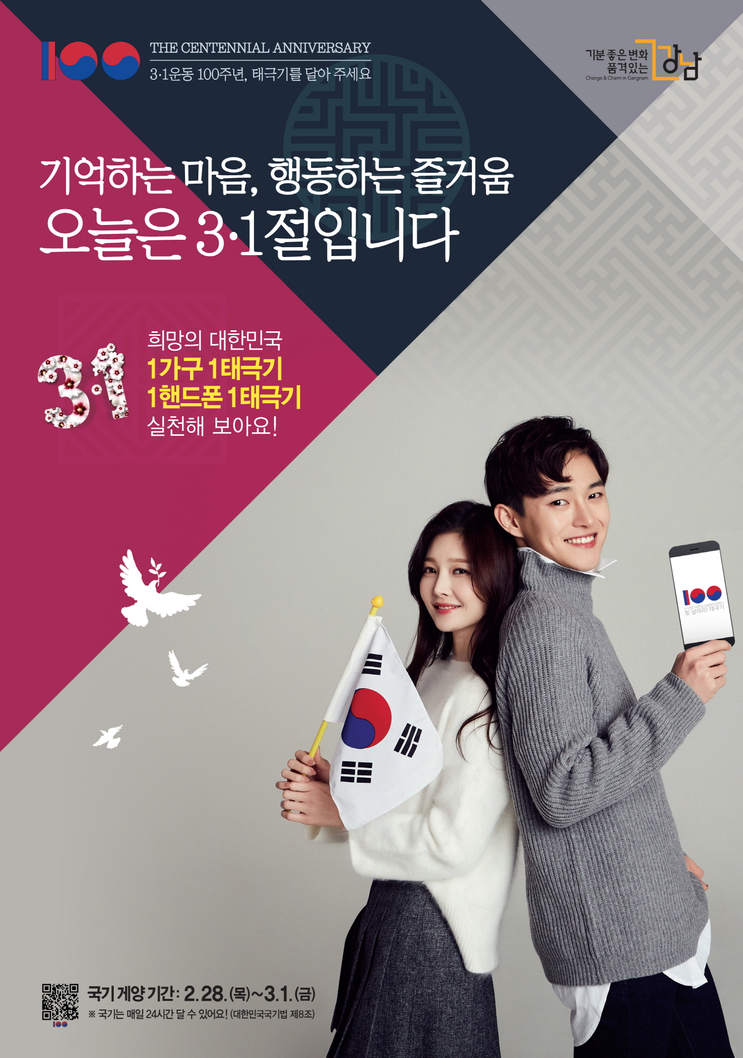 국기게양일 나라사랑의 시작이라 할 수 있는 전 구민 태극기 달기 운동을 전개하고, 특히 3·1운동(1919) 100주년을 맞이하여 가정마다 태극기가 휘날려 3·1절의 역사적 가치와 민족의식을 다시 한 번 느낄 수 있도록 적극 협조하여 주시기 바랍니다.