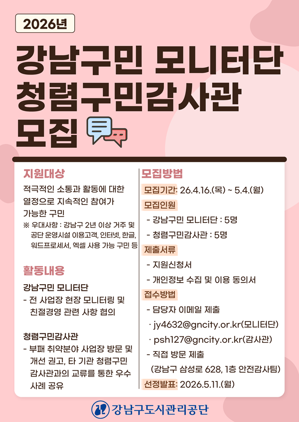 2026년 강남구민 모니터단, 청렴구민감사관을 모집하니 구민 여러분의 많은 관심 부탁드립니다.