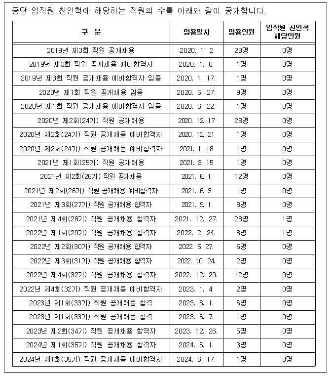 공단 친인척 현황 홈페이지 공개
