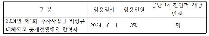 2024년 제1회 주차사업팀 비정규 대체직원 공개경쟁채용 합격자 공단 친인척 현황을 아래와 같이 공개합니다.
