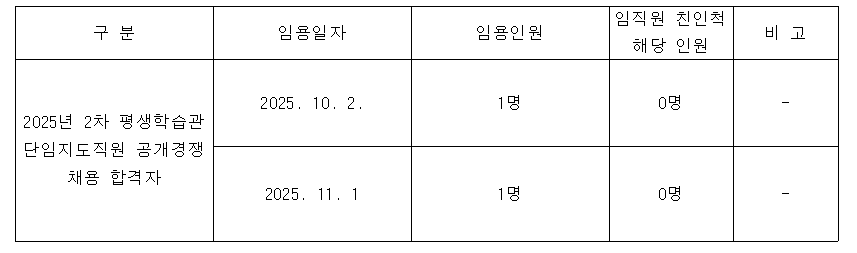 2025년 2차 평생학습관 단임지도직원 채용 직원 대상 공단 친인척 현황 공개