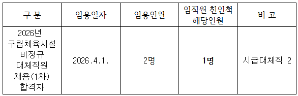 2026년 구립체육시설 비정규 대체직원 채용(1차) 채용직원 대상 공단 친인척 현황을 아래와 같이 안내합니다.