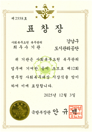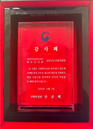 강남구도시관리공단(이사장 고광윤, 본부장 성호경)은 2025년 12월 3일 정부세종 컨벤션센터에서 개최한 제12회 사회복무대상(大賞) 시상식에서 ‘국방부장관상’을 수상했다고 밝혔다.