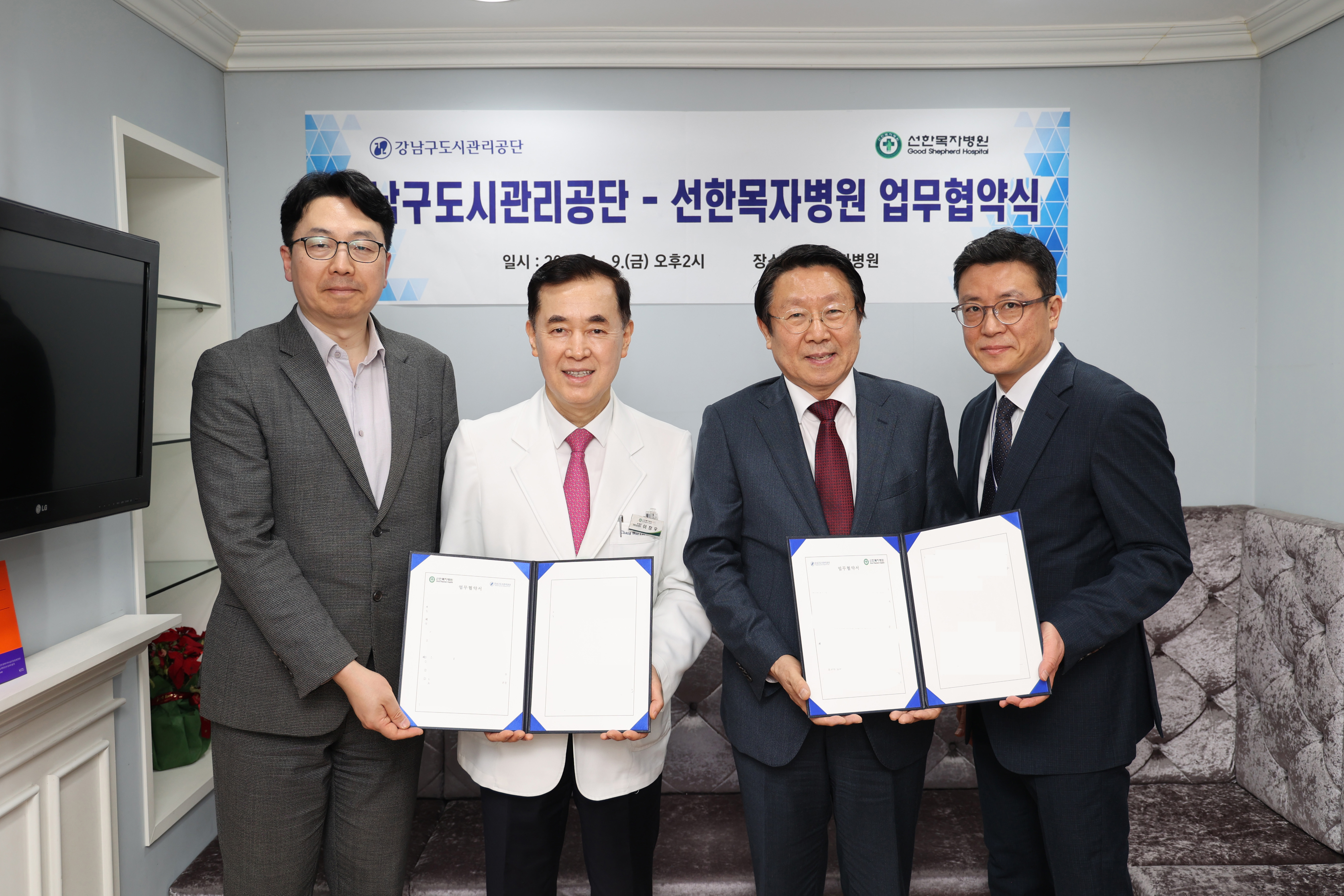 강남구도시관리공단(이사장 고광윤, 본부장 성호경)은 지난 1월 9일(금) 강남구 역삼동에 위치한 선한목자병원과 공단 임직원 및 직계가족의 건강 증진과 복지 향상을 위한 업무협약을 체결했다.