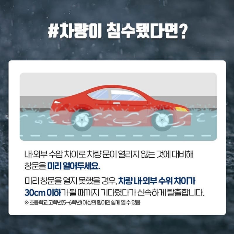 - 미리 창문을 열지 못했을 경우, 차량 내·외부 수위 차이가 30cm 이하가 될 때까지 기다렸다가 신속하게 탈출합니다.