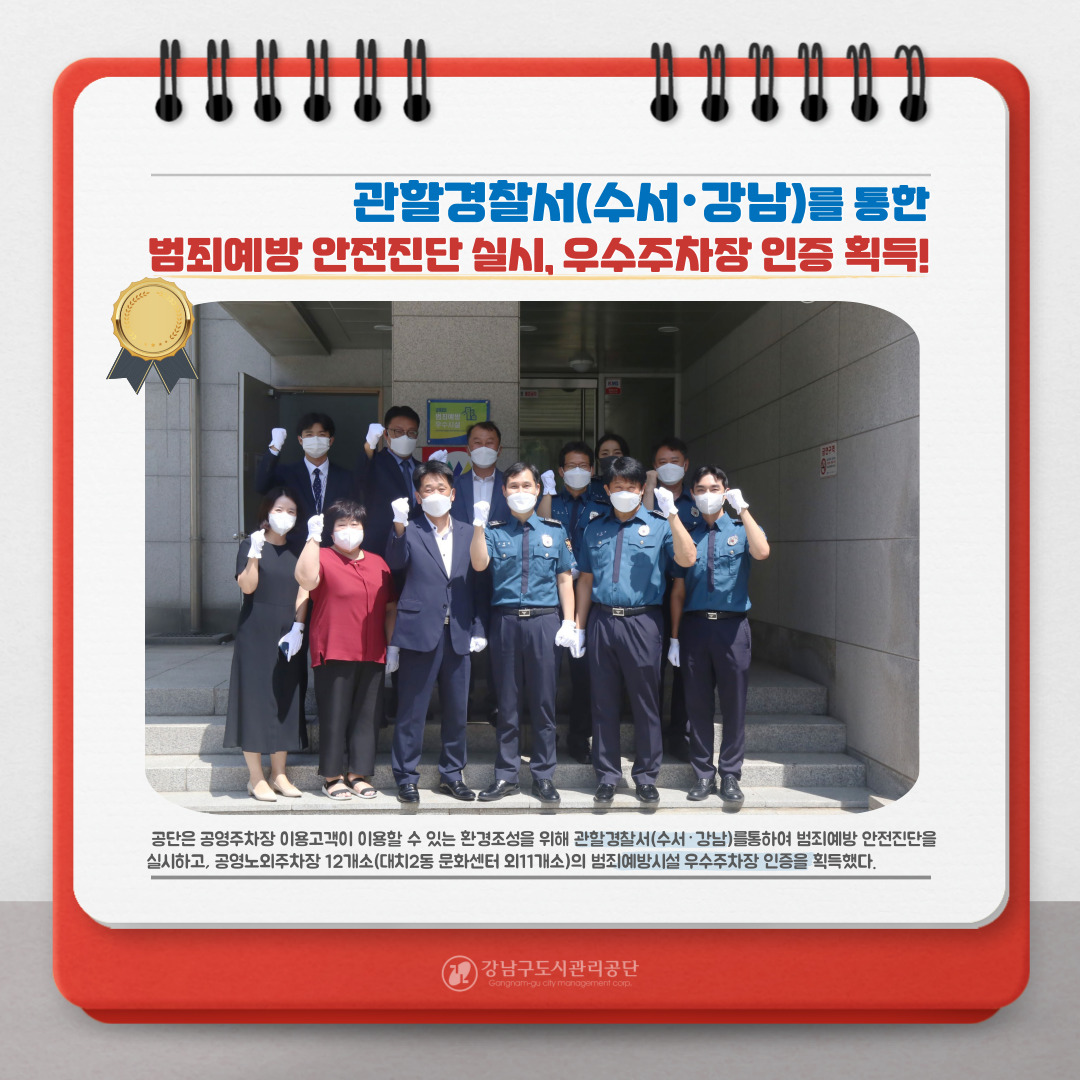 - 공단은 공영주차장 이용고객이 이용할 수 있는 환경조성을 위해 관할경찰서(수서·강남)를 통하여 범죄예방 안전진단을 실시하고, 공영노외주차장 12개소(대치2동 문화센터 외11개소)의 범죄예방시설 우수주차장 인증을 획득했다.