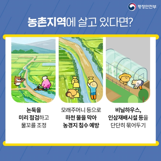 - 모래주머니 등으로 하천 물을 막아 농경지 침수 예방