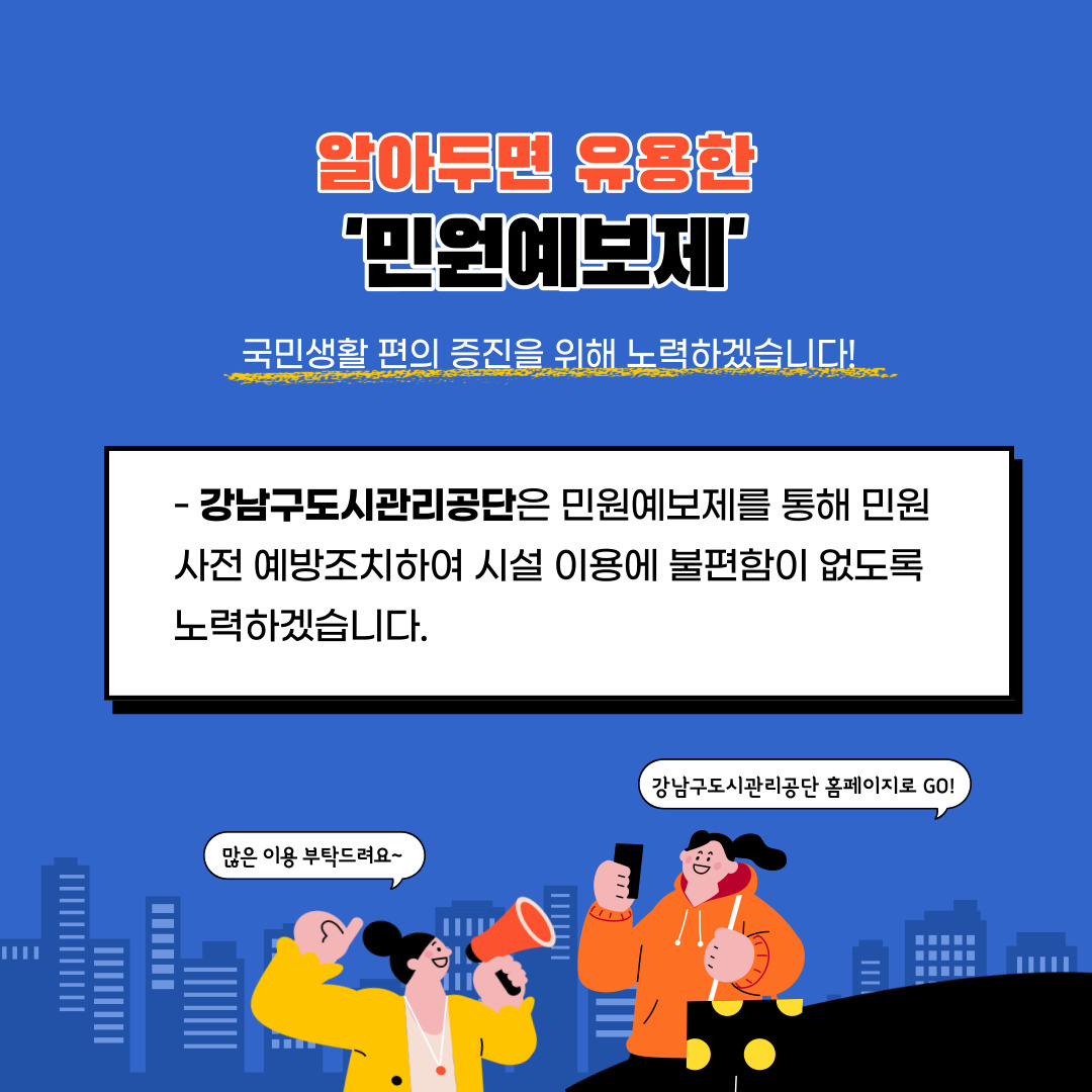 - 강남구도시관리공단은 민원예보제를 통해 민원 사전 예방조치하여 시설 이용에 불편함이 없도록 노력하겠습니다.