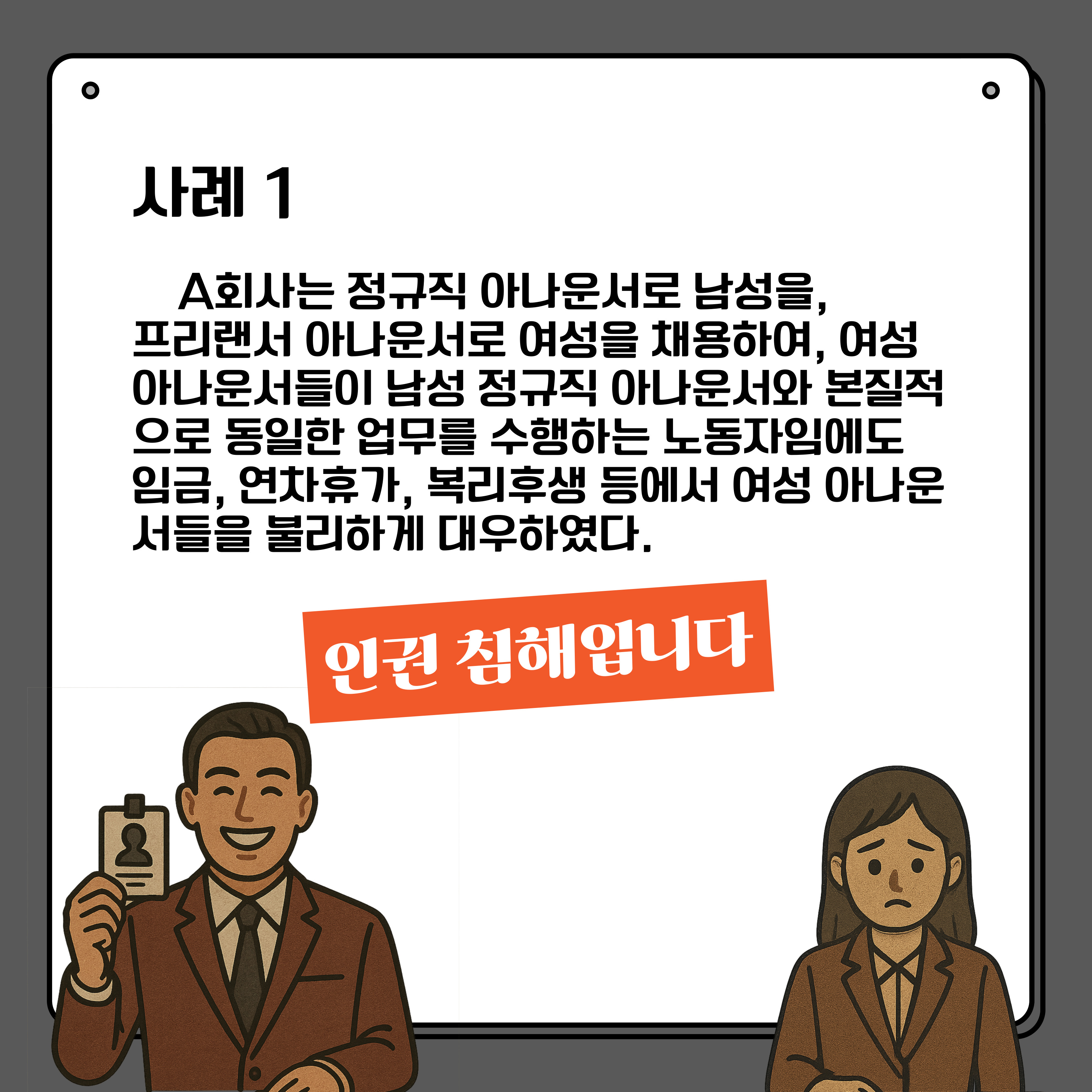 예를 들어, 동일 업무에 대한 불합리한 처우, 외모 기준 강요, 집단 따돌림 등이 이에 해당합니다.