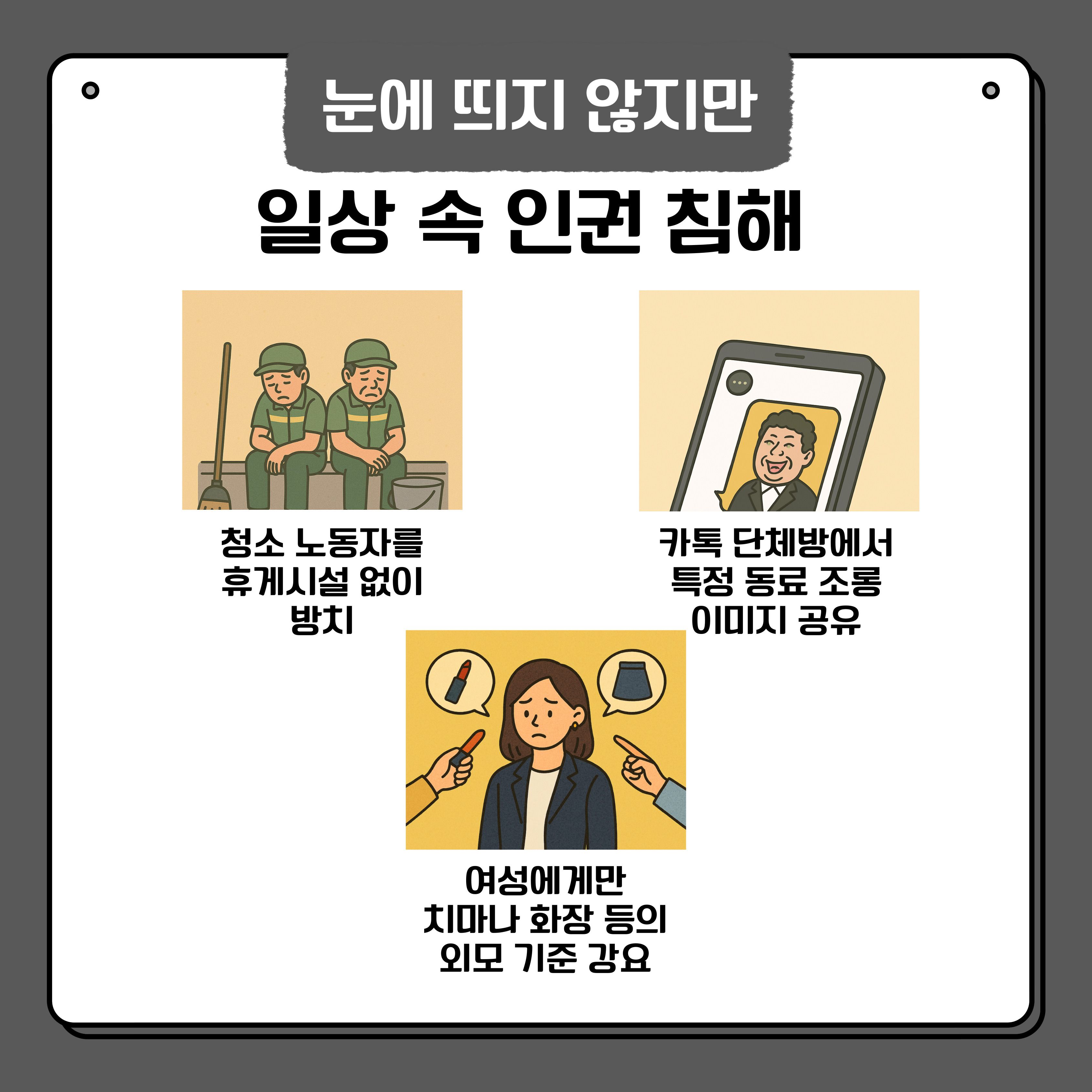 우리 주변에는 눈에 띄지 않지만 다양한 형태의 인권 침해가 존재합니다.