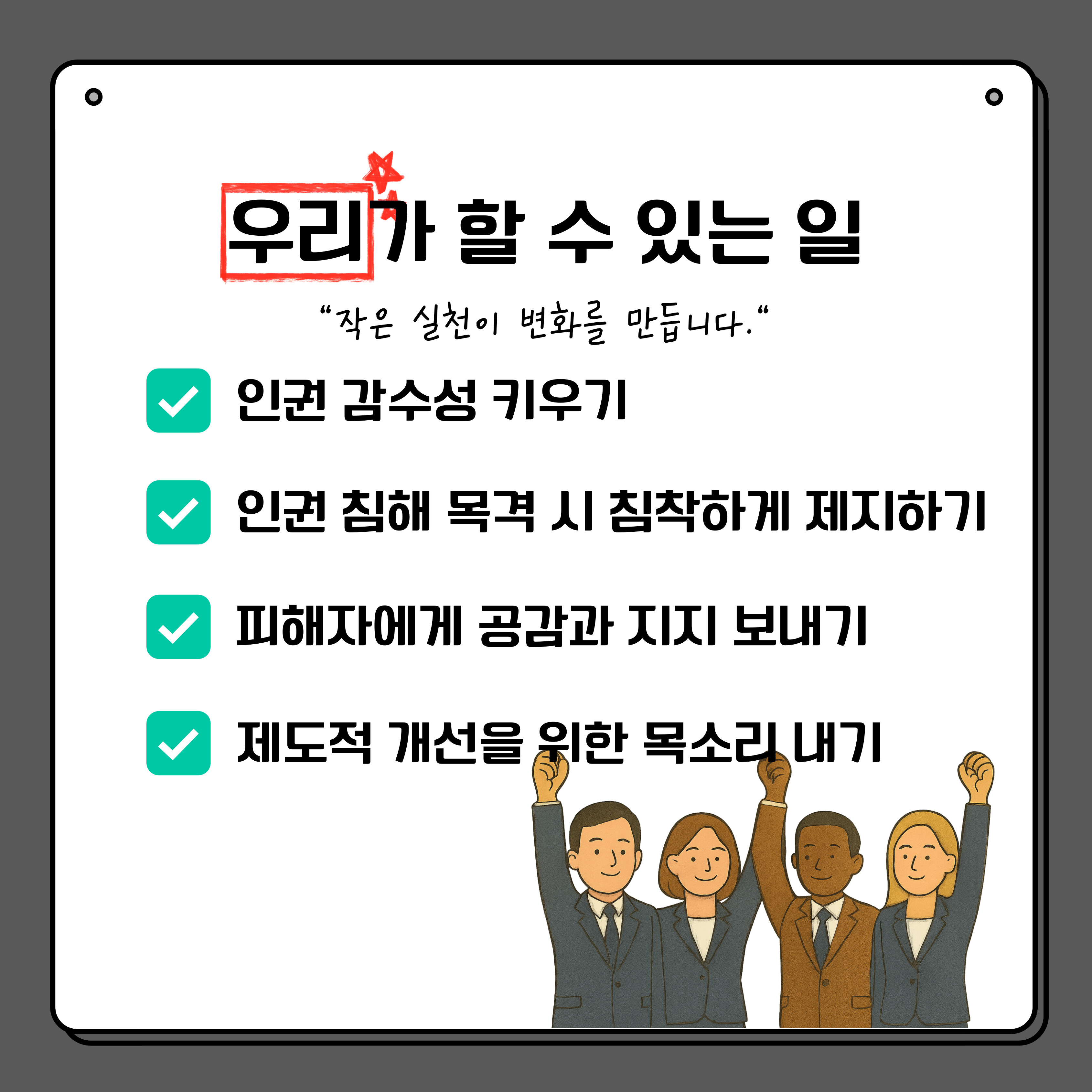 우리는 인권 감수성을 키우고, 침해 상황에서는 침묵하지 않고 제지하며 피해자에게 공감과 지지를 보내야 합니다.